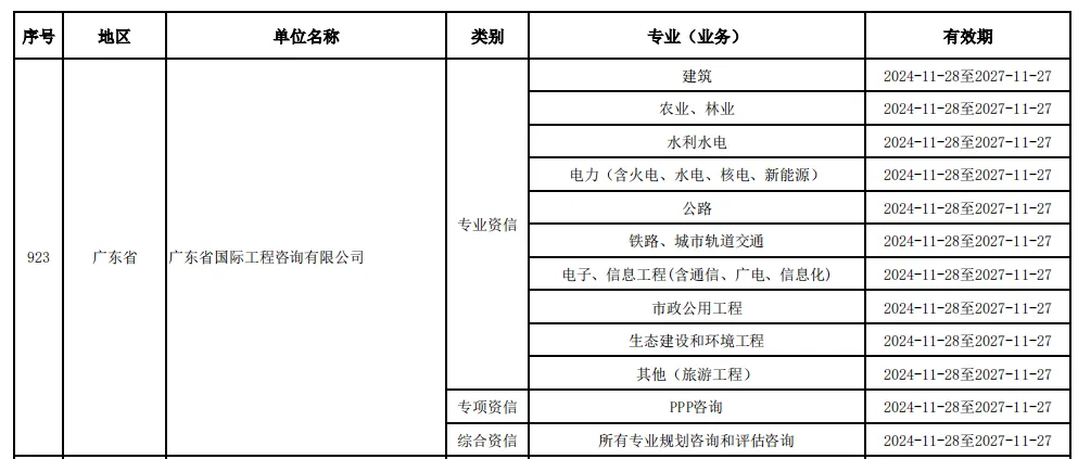 日前,中國工程咨詢協會公布了獲得2024年第二批次符合甲級資信評價標準的工程咨詢單位名單,廣咨國際集團全資子公司廣東省國際工程咨詢有限公司再創佳績,成功延續了甲級綜合資信、甲級專項資信和原有8個甲級專業資信,還新增獲得了電力(含火電、水電、核電、新能源)和其他(旅游工程)2個甲級專業資信,甲級專業資信數量達到10個。